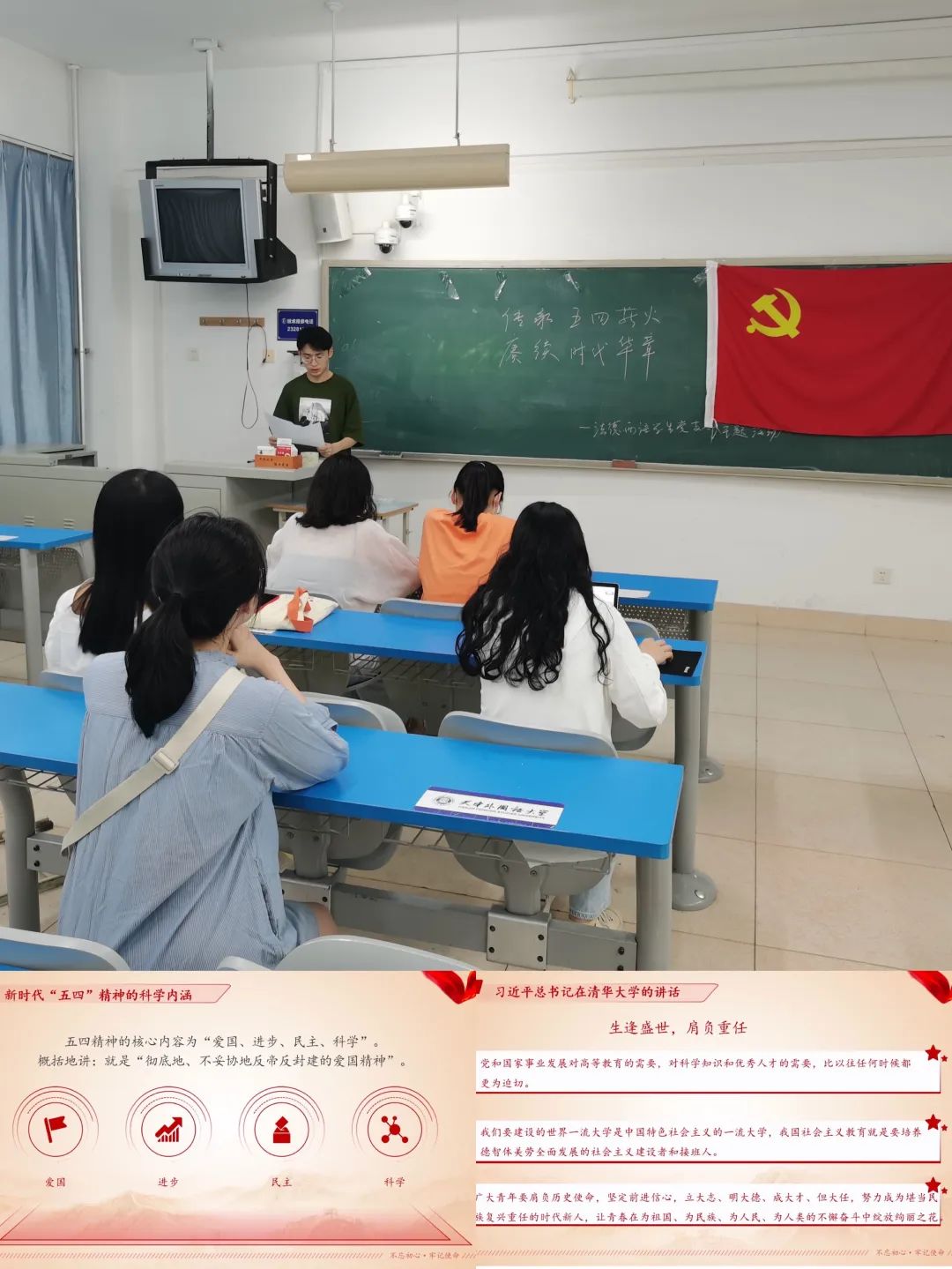 党日活动从回首“五四”运动拉开帷幕。在梳理五四运动的起因、经过中,踏寻先辈足迹,重温五四精神,再一次感受到“五四”运动对中国革命的重要意义,同时全体党员深入学习了习近平总书记在视察清华大学时的讲话精神。支部党员纷纷表示,虽然这场革命已经过去了102年,但五四精神代代相传。作为天外青年,我们铭记历史,不忘初心,牢记习近平总书记对当代青年的殷殷寄语,勇担时代使命,绽放青春光彩。